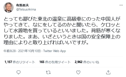 というツイートがありました。この早稲田大学教授の有馬哲夫氏はここ最近歴史問題などで暴れているという印象ですか、今回は置いといてこの「東北の水源地を中国人が買った」話について。ネット右派によるテンプレ的な文言ではあるものの、それはともかくと…