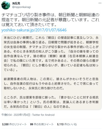 1994年の北朝鮮の核疑惑にまつわる報道により、その年の4月14日から「チマ・チョゴリ切り裂き事件」とでもいうべき事象が発生します。で、この事件については主に極右方面から総連による自作自演説というものがごく一部とはいえ存在します。中々この事件につ…