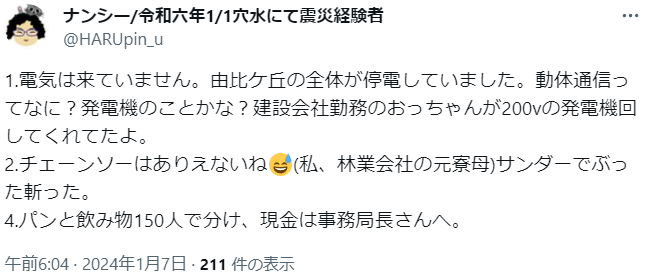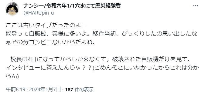 ※上記投稿に対して1日当日に穴水高校に避難していたアカウントがRTしていたことを付記する