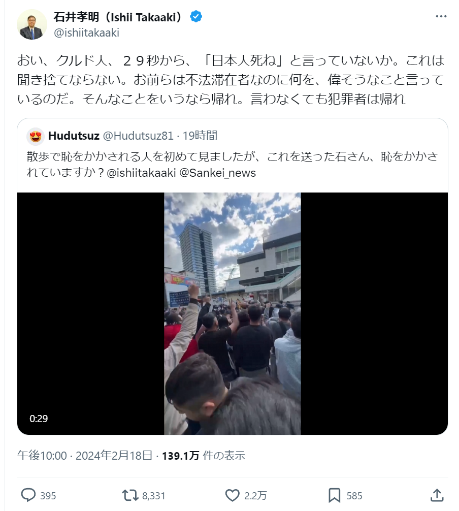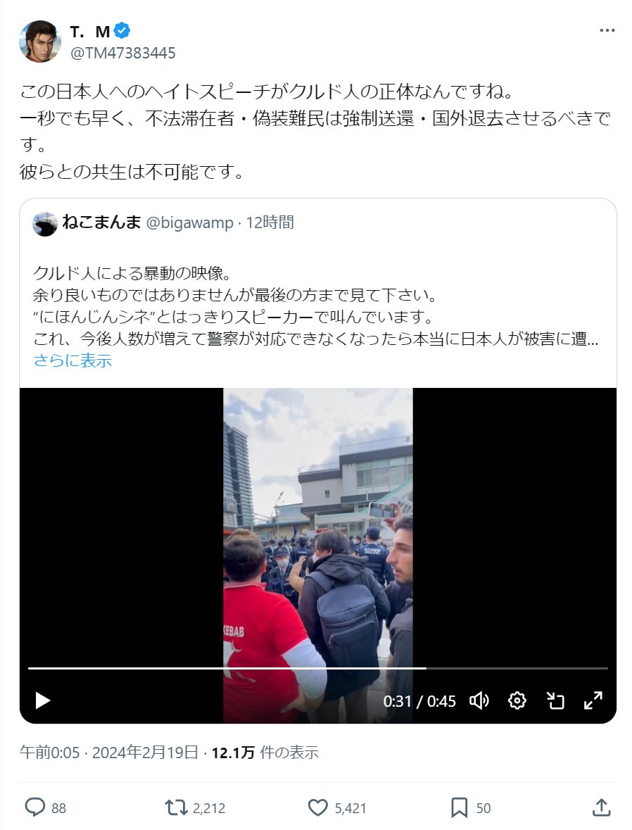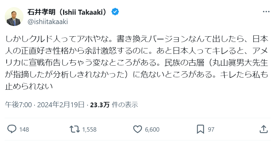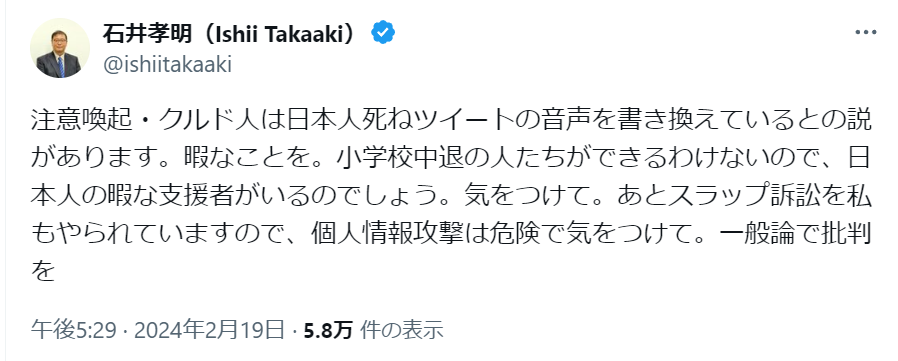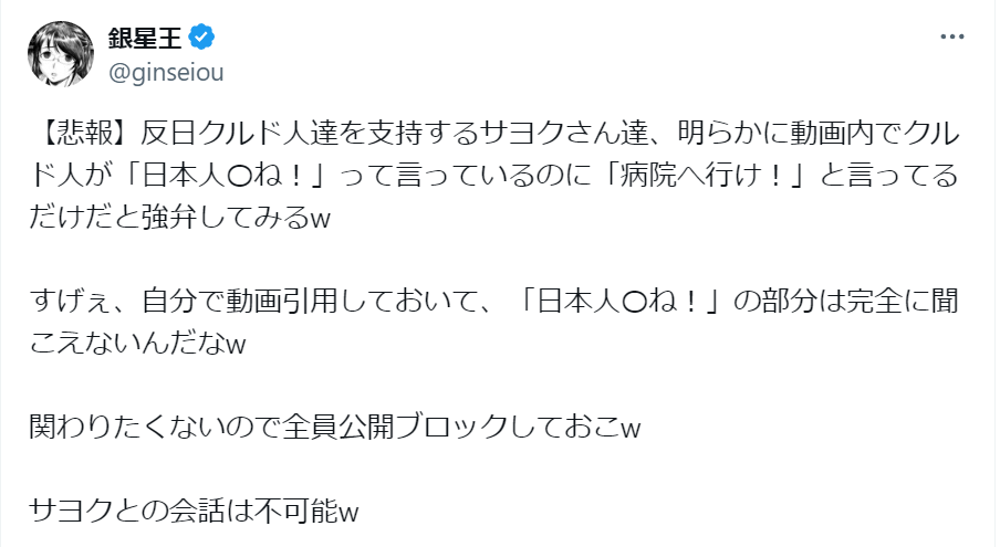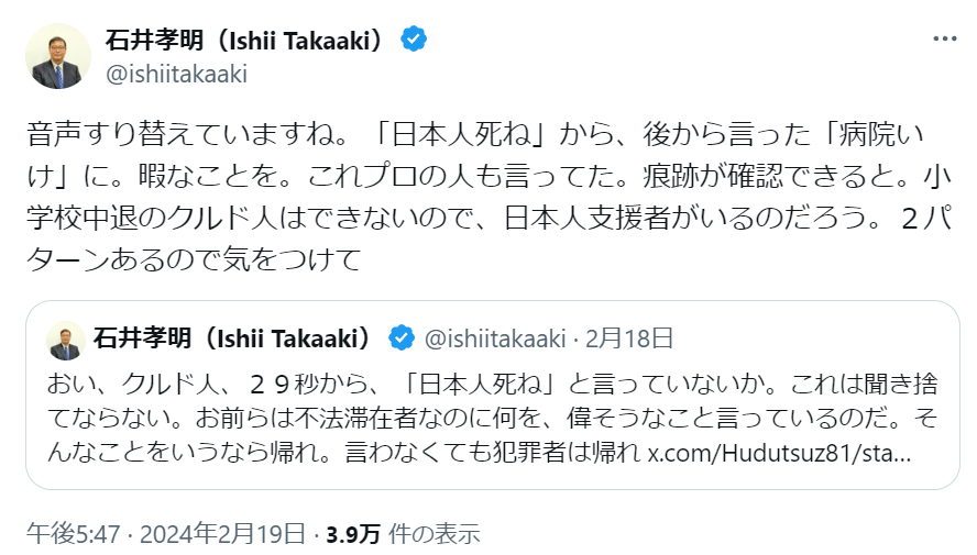 以上の様に動画を聞いたうえでも彼らは「日本人死ね」と聞こえている。サヨクが「病院に行け」と強弁したと言っているアカウント存在しており、ここまでくると彼らは「そう聞こえる」のだろうとしか言えない。最早ここまでくるとこの件で言葉を交わして議論をすること自体不可能だろう。それが少数ならばよかったが、石井やその投稿に付和雷同するアカウント、まとめブログもえるあじあの「【恐怖】埼玉県、駅前でクルド人集団が怒号「ニホンジンシネ!」連呼」などによって、あたかもクルド人が「日本人死ね」と言っている事が半ば既成事実化して語られている*1。石井孝明はSNS上におけるクルド人へのバッシング言説のオピニオンリーダーといえるが、しかし彼自身の発信は以前にも指摘した様にそのソースが胡乱であり、信用に値するとは言えないレベルのものも存在する。今回もそれに値するが、さらに一歩先に進んだ感がある。多くの人がまっさらな状態で聞けば「病院に行け」と聞こえると思える音声だ。それが簡単に覆されている。ものすごい粗悪で悪質な語り手に語り場がジャックされている。