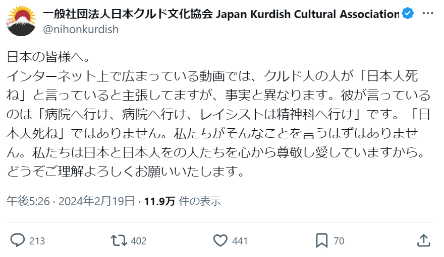 一般社団法人日本クルド文化協会が以下の様な投稿をしている。