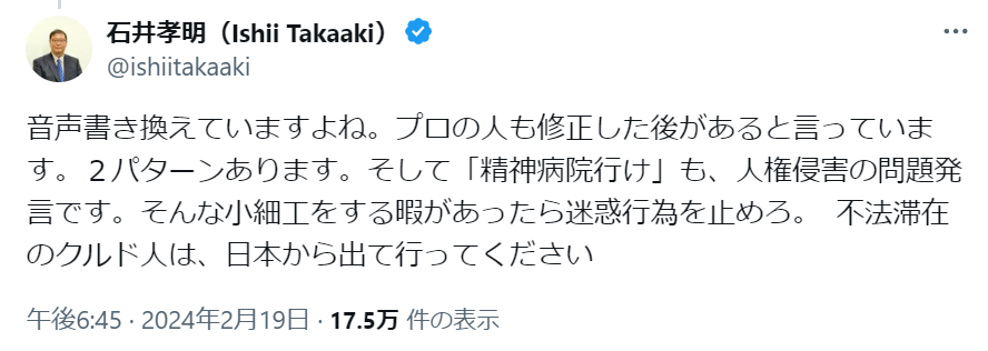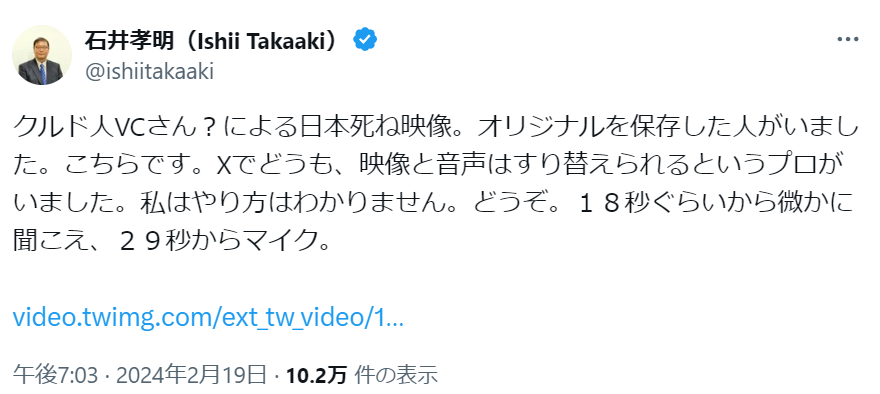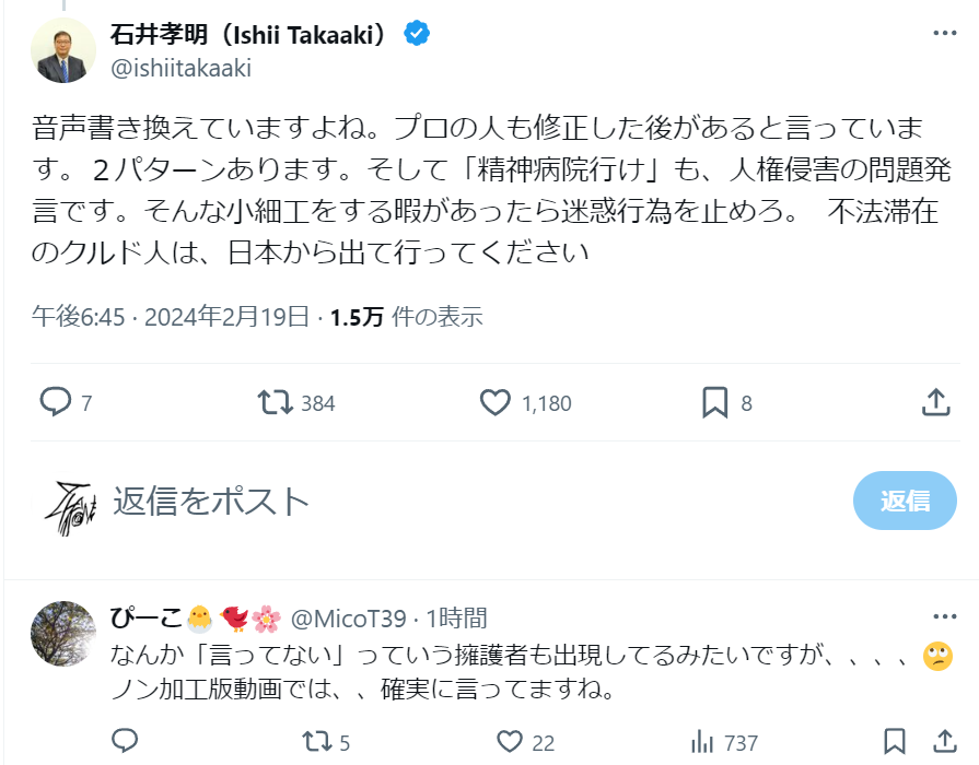 20日の11時時点で確認できるだけですり替え説と言える投稿を13個ほどしている。追記にも書いたが石井孝明が「日本人死ね」と聞いたと言っている動画は@Hudutsuz81の投稿への引用投稿であり、「病院に行け」と聞いた人間が聞いているのもその動画だ。音声すり替えもクソもない。もしも石井孝明が今聞いて「病院に行け」と聞こえているならばそれは謎の「プロの人」がいうところの修正ではなく、石井孝明が最初に聞き間違えたのを自白している様なものでは。音声すり替え説をこんな多く投稿しているのも言い訳がましくみえる。
